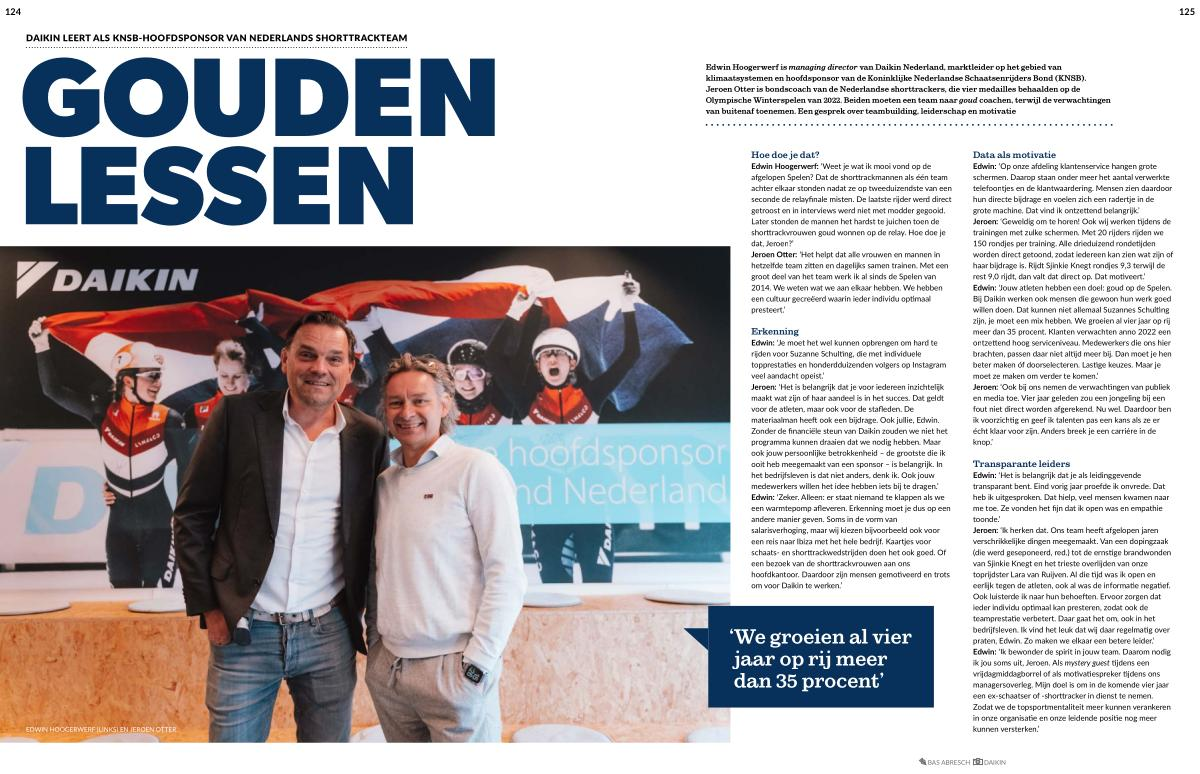 Edwin Hoogerwerf is managing director van Daikin Nederland , marktleider op het gebied van klimaatsystemen en hoofdsponsor van de Koninklijke Nederlandse Schaatsenrijders Bond ( KNSB ). Jeroen Otter is bondscoach van de Nederlandse shorttrackers , die vier medailles behaalden op de Olympische Winterspelen van 2022 . Beiden moeten een team naar goud coachen , terwijl de verwachtingen van buitenaf toenemen . Een gesprek over teambuilding , leiderschap en motivatie
