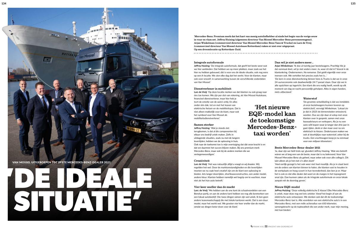 Beste Mercedes-Benz-dealer 2021 ‘ Ja , daar zijn we héél trots op ’, glundert Jeffrey Huizing . ‘ Wat ons betreft wáren we al lang een van de beste , maar dat is nu bekroond . Voor Van Mossel Mercedes-Benz als geheel , maar zeker ook voor alle collega ’ s . Dit lukt alleen als je het met z ’ n allen doet !’ ‘ Heel eerlijk gezegd is het ook weer niet heel moeilijk . Als je in staat bent om de orders van klanten binnen te halen , die klanten vast te houden in de werkplaats en hoog scoort in hun tevredenheid , dan ben je er . Maar het is ook zo dat elke dealer dat weet en de marges in het topsegment smal zijn . Dan kunnen zaken als de integrale autoformule en onze lokale aanpak nét de doorslag geven .’