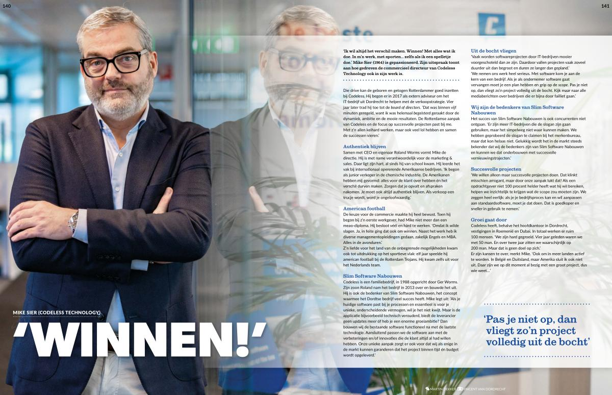‘ Ik wil altijd het verschil maken . Winnen ! Met alles wat ik doe . In m ’ n werk , met sporten … zelfs als ik een spelletje doe .’ Mike Sier ( 1964 ) is gepassioneerd . Zijn uitspraak toont aan hoe gedreven de commercieel directeur van Codeless Technology ook in zijn werk is .