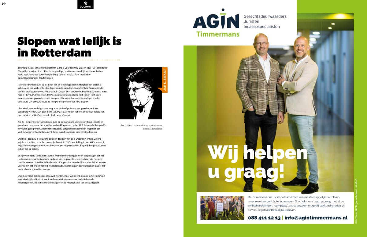 Ik vind de Pompenburg op de hoek van de Coolsingel en het Hofplein een oerlelijk gebouw op een verkeerde plek . Erger dan de naoorlogse noodwinkels . Terrasvrienden van het architectenniveau Pieter Schol – zwaar SP – vinden dat kwaliteitsschennis , maar mag ik ? Ik vind Caroline van der Plas een leuk mens en Kaag niet . Ik ben toch geen zware veteraan geworden om in een geschifte wereld onnozel te eindigen zonder voorkeur ? Dat gebouw naast de Pompenburg vind ik ook niks . Slopen !