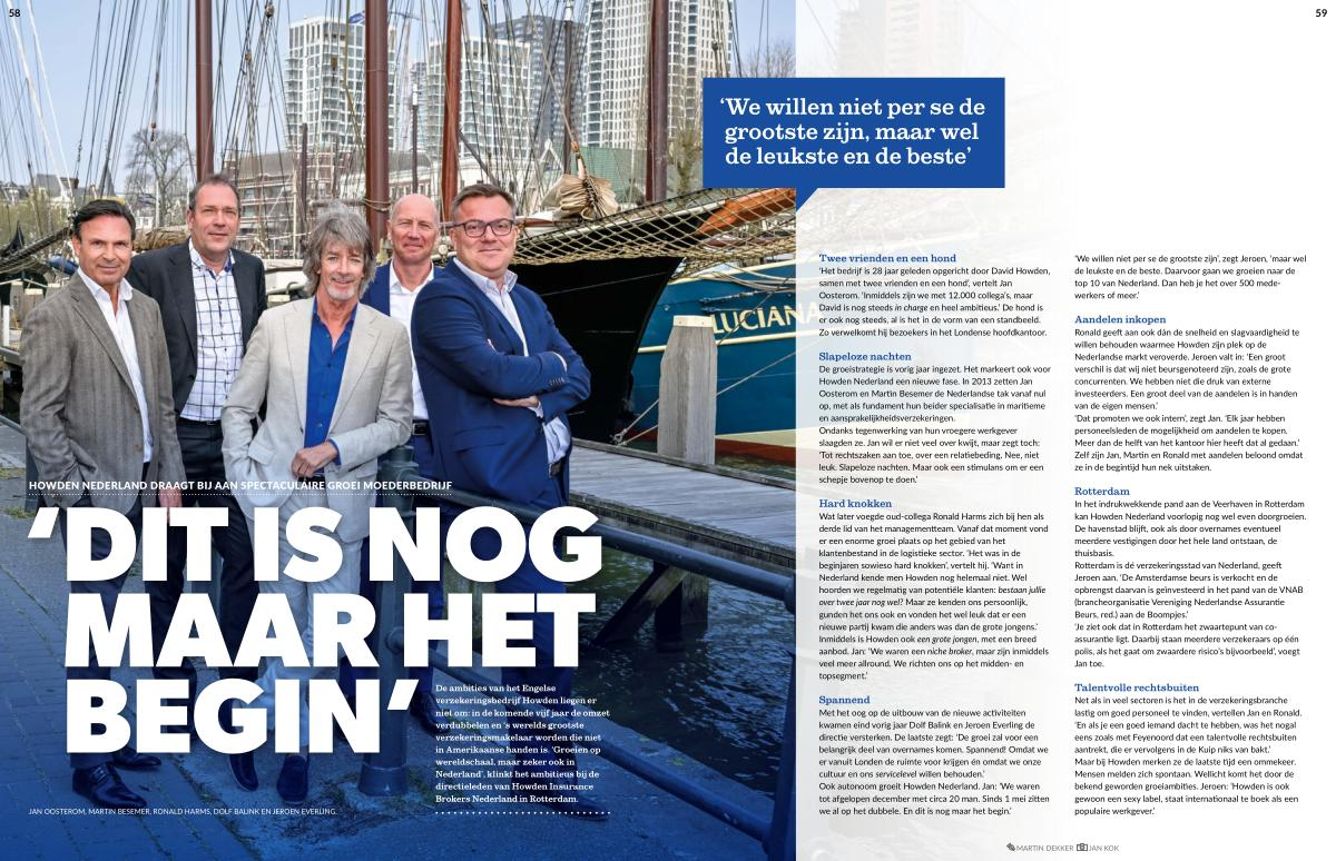 De ambities van het Engelse verzekeringsbedrijf Howden liegen er niet om : in de komende vijf jaar de omzet verdubbelen en ‘ s werelds grootste verzekeringsmakelaar worden die niet in Amerikaanse handen is . ‘ Groeien op wereldschaal , maar zeker ook in Nederland ’, klinkt het ambitieus bij de directieleden van Howden Insurance Brokers Nederland in Rotterdam .