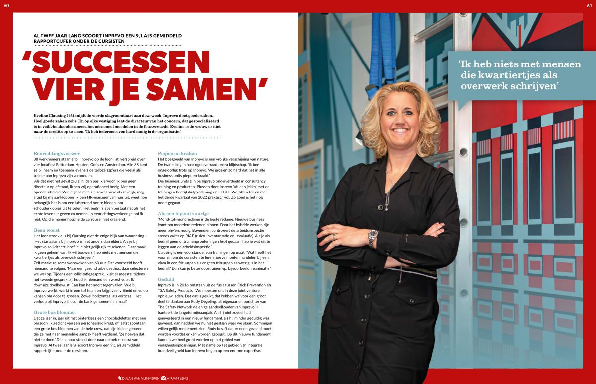 Eveline Clausing ( 46 ) snijdt de vierde slagroomtaart aan deze week . Inprevo doet goede zaken . Heel goede zaken zelfs . En op elke vestiging laat de directeur van het concern , dat gespecialiseerd is in veiligheidsoplossingen , het personeel meedelen in de feestvreugde . Eveline is de vrouw er niet naar de credits op te eisen . ‘ Ik heb iedereen even hard nodig in de organisatie .’