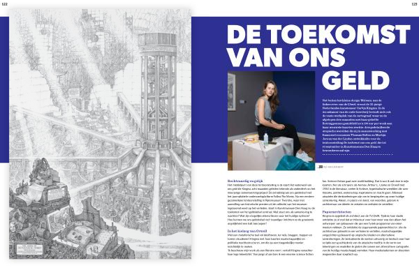 Net buiten het kleine dorpje Welsum , aan de linkeroever van de IJssel , woont de 32-jarige Nederlandse kunstenaar Carlijn Kingma . In de woonkamer van de oude boerderij bevindt zich ook de vaste werkplek van de cartograaf , waar ze de afgelopen drie maanden met haar geliefde Rotringpennen gemiddeld zo ’ n 100 uur per week aan haar nieuwste kaarten werkte : drie gedetailleerde utopische werelden die zij in samenwerking met financieel economen Thomas Bollen en Martijn Jeroen van der Linden ontwikkelde voor de tentoonstelling De toekomst van ons geld , die tot 10 september in Kunstmuseum Den Haag te bewonderen zal zijn .
