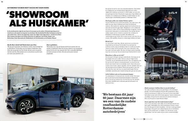 Toch zijn jullie een relatief kleine speler … ‘ Bewust . Wij kiezen een andere benadering , onze eigen koers . We willen ons qua volume helemaal niet meten met die grote bedrijven . We hebben het eigenlijk omgedraaid . Autoverkoop zou veel meer via internet gaan lopen . Wij geloven in een combinatie van online en offline . Als het showroombezoek terugloopt , moet je mensen een reden geven om wél te komen . Dus vandaar dat wij hebben ingezet om de mooiste en grootste Kia-vestiging van Nederland of zelfs Europa te worden . We hebben een huiskamergevoel gecreëerd . Hier kunnen mensen ook meer zien en ervaren . Alle modellen , kleuren en uitvoeringen hebben we staan …