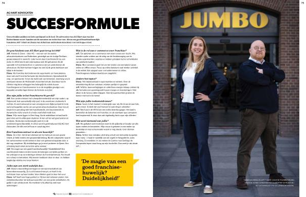 De geschiedenis van AG Hart gaat terug tot 1901 ! Jeff : ‘ Anema & Greve – later AG – was een van de oudste advocatenkantoren van Rotterdam , gevestigd aan de statige Parklaan , gespecialiseerd in zeerecht . Later kwam daar franchiserecht bij . Een niche . In 2012 ben ik met mijn kantoor met AG gefuseerd . Als dé specialist in franchiserecht en e-commerce zijn we uniek binnen de advocatuur . Als klein kantoor krijgen we ook bij de grote bedrijven een kijkje in de keuken .’ Diana : ‘ Als franchise kent iedereen de supermarkt- en horecaketens , maar ook veel franchiseformules zijn dienstverleners , bijvoorbeeld de zorg- en sportsector . Ik ken de markt ook van binnenuit . Jarenlang was ik werkzaam binnen de McDonald ’ s franchiseformule . Daardoor kan ik cliënten nog beter uitleggen hoe belangrijk de relatie tussen franchisegever en franchisenemer is en de mogelijke gevolgen van bepaalde veranderingen binnen de formule overzien .’