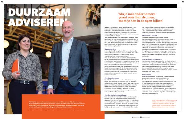 Aan tafel met ondernemers Over duurzaam adviseren gesproken : Evert en Saskia werken al decennia met veel plezier bij ING . ‘ Ik blijf het geweldig vinden om ondernemers te helpen met financieringsaanvragen , onder meer op het gebied van duurzaamheid en overnames ’, zegt Saskia enthousiast . ‘ Als je het small & medium enterprises-segment bedient , praat je rechtstreeks met ondernemers over hun dromen en ambities . Niks mooier dan dat !’