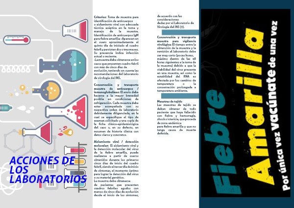 Aislamiento viral / detección molecular: El aislamiento viral y la detección molecular del virus de la fiebre amarilla, puede realizarse a partir de sueros obtenidos durante los primeros cinco días de inicio del cuadro febril, siendo el tercer día de inicio de síntomas, el momento óptimo para lograr la detección del virus o su material genético.