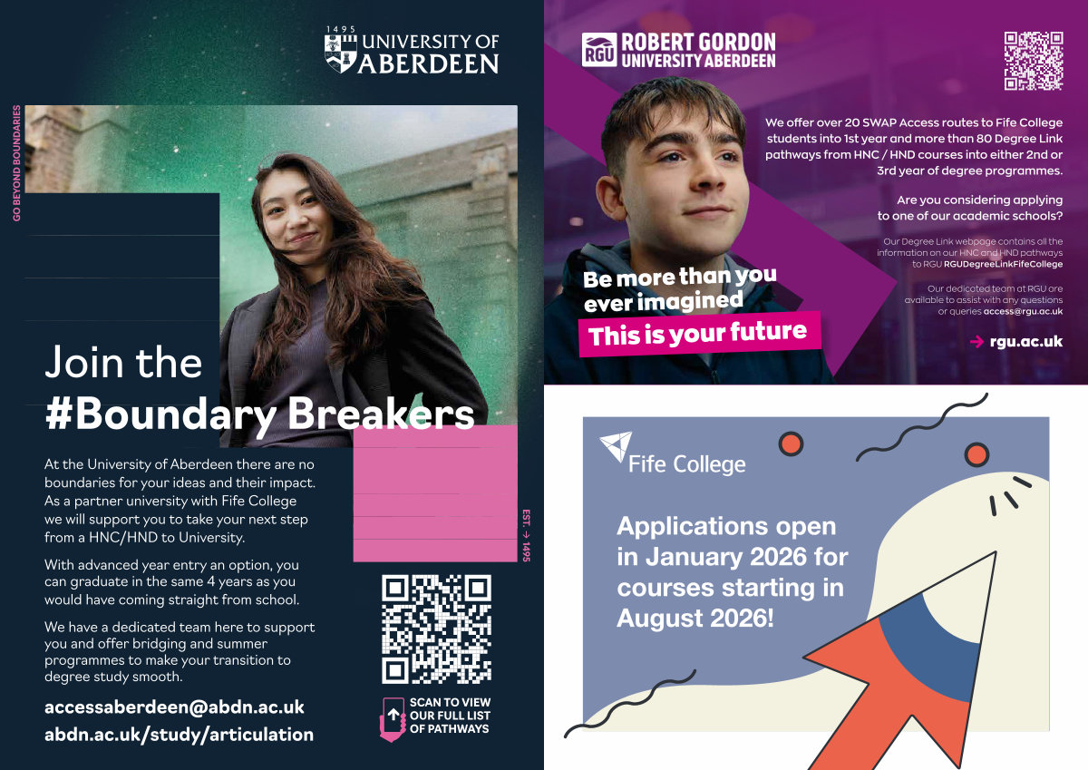 We offer over 20 SWAP Access routes to Fife College students into 1st year and more than 80 Degree Link pathways from HNC / HND courses into either 2nd or