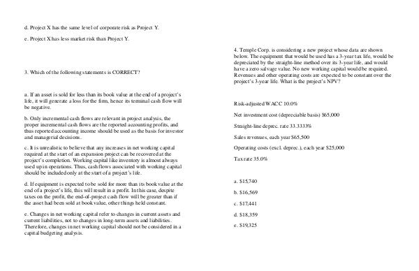 d. Project X has the same level of corporate risk as Project Y. e. Project X has less market risk than Project Y.