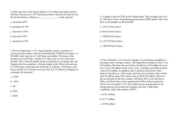 3. Stover Corporation, a U. S. based importer, makes a purchase of crystal glassware from a firm in Switzerland for 39,960 Swiss francs, or $ 24,000, at the spot rate of 1.665 francs per dollar. The terms of the purchase are net 90 days, and the U. S. firm wants to cover this trade payable with a forward market hedge to eliminate its exchange rate risk. Suppose the firm completes a forward hedge at the 90-day forward rate of 1.682 francs. If the spot rate in 90 days is actually 1.638 francs, how much will the U. S. firm have saved or lost in U. S. dollars by hedging its exchange rate exposure?
