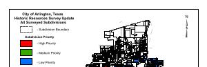 Lake Arlington Estates Couch Estates Oak Rdige Estates Lake Hill Estates Watercrest Estates Perkins Pounds Oak Creek Estates Moore-Dobkinds Estates Shane Meadow Rush Creek Estates Estate Gardens Rush Creek Ranch Estates Southland Acres Highands Schooler Tracts Farmdale Scots Wood Estates Fielder Terrace Shady Oaks Strickland Roy Jones Elmo Shady Oak Estates Watsonville Heights Mountain View Southpark Sunbelt Business Park Arlington Brookhollow Highland Acres GSID COMM 1 GSID 2 COMM 2 GSID 1 INST COMM 2 Willis Subdivison Silver Belle Estates Midway Estates Arlington Statium Arlington Gardens Fruitvale Acres Guerin M Tanglewood Johnson Hollandale Estates Western Plains Estates Hollandale Buena Vista Parkview Eltroy Heights Plaza Heights Timberdale Dalby Acres East Crestwood Reynolds H W Reaves Subdivison Oak Park Subdivision Avondale Place Murray Estates Double Y Wooded Estates Waldrop Heights Indian Hill Southgate Hillcrest Park Valley View Lake Park Estates Sylvan Heights Arlington Estates Arlington Terrace Arlington Manor Phillips Park Meadowbrook Park Schoeneman South Collins Terrace Kathadie Corners Dunning Ridge Terrace Ditton & Collins Pecan Park Milby W P Forest Park Sherwood Knoll Ramsey Pecan Acres Elliot Heights Daggett E Daggett E Daggett E West Hills Arlington West Pecan Park Pike View Panhandle Park Subdivision Davis Sol Club Oaks Glynn Oaks Mill Creek Estates Elm Shadows Elm Shadows Inwood Estates Harris Heights Park Row Glynndale Clover Park Briarwood Estates Arlington Park Westwood Miller Subdivision Crestridge Robin Hood Oak Tree Estates Briarwood West Wilemon Subdivision College Hills Pine Grove University Hills Medlin O Medlin O Medlin O McNight Manor Southridge Park Brookview Clubview Reico Ind Peterman Davis Subdivision Collage Oaks Cedar Oaks Meadow Oaks Cedar Springs Huitt J Tompkins Echols Rosemary Gould Medlin O Casa Loma Davis Manor Hall & Phillips Southwood Acres McNight Manor West Summit Grove Fielder Robert Jordon Jerry Oakdale Hollis Town North Fairview Baptist Temple Huitt J Huitt J Huitt J Southdale Brown McNatt Hurn Heights Reddy McGrew Morgon Ritchie-Haydon Summerhill Walker I K Harkey Moore & Bobo Brasher & Keith Brookhollow Jones Odell Brasher Bryant Thad A Glass Masonic Heights Scott Deering Knox Elson Orchard Moore and Ransom Philips Thomas Heirs Hill Top Moore LH Threlkeld Gunn MS Burton Heights Rose & Yates Dennis Norris Reddy Toliver Joseph Cain Brogdon Bill Benton Johnson Hayden Sunset Monticello Benge A Northwest Heights Bradley Harold Bump Cooper Addition Pankhurst Rucker Ivy Estates Ivy Terrace T . A . Keith McKnight & Putnman Ellis Hiett COLLINS HUDSON CEMETERY AVENUE F SH 360 SH 360 GOLF CLUB WATSON LAKEWO OD I20 WB 453 SB SH 360 MARRO W BONE S P RING SH 360 I20 EB 453 NB I20 WB 444 SEB RANDOL MILL PARK EDEN BOWMAN SPRINGS INTERSTATE 30 INTERSTATE 20 LAKE ARLINGTON HOLLAND INTERSTATE 30 INTERSTATE 20 INTERSTATE 20 INTERSTATE 20 INTERSTATE 20 DEBBIE SH 360 DIVISION US 287 US 287 BUS WET WILN D SH 360 INTERSTATE 20 INTERSTATE 30 COMMERCIAL INTERSTATE 20 US 287 BUS ORION COMMERCIAL TRINITY SH 360 COOPER WATSON SH 360 SH 360 I20 EB 444 SEB INTERSTATE 20 INTERSTATE 20 CALLOWAY CEMETERY CAGLE CROW COOPER US 287 DICK PRICE SH 360 US 287 US 287 COPELAND INTERSTATE 30 SHADY INTERSTATE 20 INTERSTATE 20 WATSON 107TH US 287 INTERSTATE 30 INTERSTATE 30 INTERSTATE 30 INTERSTATE 20 WATSON SH 360 287 NWB 444 WB DAN GOULD US 287 SPORT CENTER INTERSTATE 20 US 287 MANSFIELD WEBB S IX FLA GS MAL L INTERSTATE 20 SH360 NB 453 WB TURNER INTERSTATE 20 US 287 GREENBELT INTERSTATE 30 INTERSTATE 20 ARBROOK INTERSTATE 20 EMBARCADERO WATSON MATLOCK US 287 DIVISION US 287 VANDERGRIFF PIONEER ENTERPRISE HARRIS LAMAR SH 360 DOTTIE LYNN EDEN FOUNTAIN WOOD MANSFIELD CARDINAL INTERSTATE 20 SH360 NB 453 W B RANDOL M ILL P ARK HIDDEN OAKS GREEN OAKS INTERSTATE 20 SH 360 T URNER W ARNELL BARDIN WATSON GREAT SOUTHWEST D OTTIE L YNN US 287 City of Arlington , Texas Historic Resources Survey Update All Surveyed Subdivisions 0 10 5 Miles - Subdivision Boundary - High Priority - Medium Priority - Low Priority Subdivision Priority NW NE SW SE