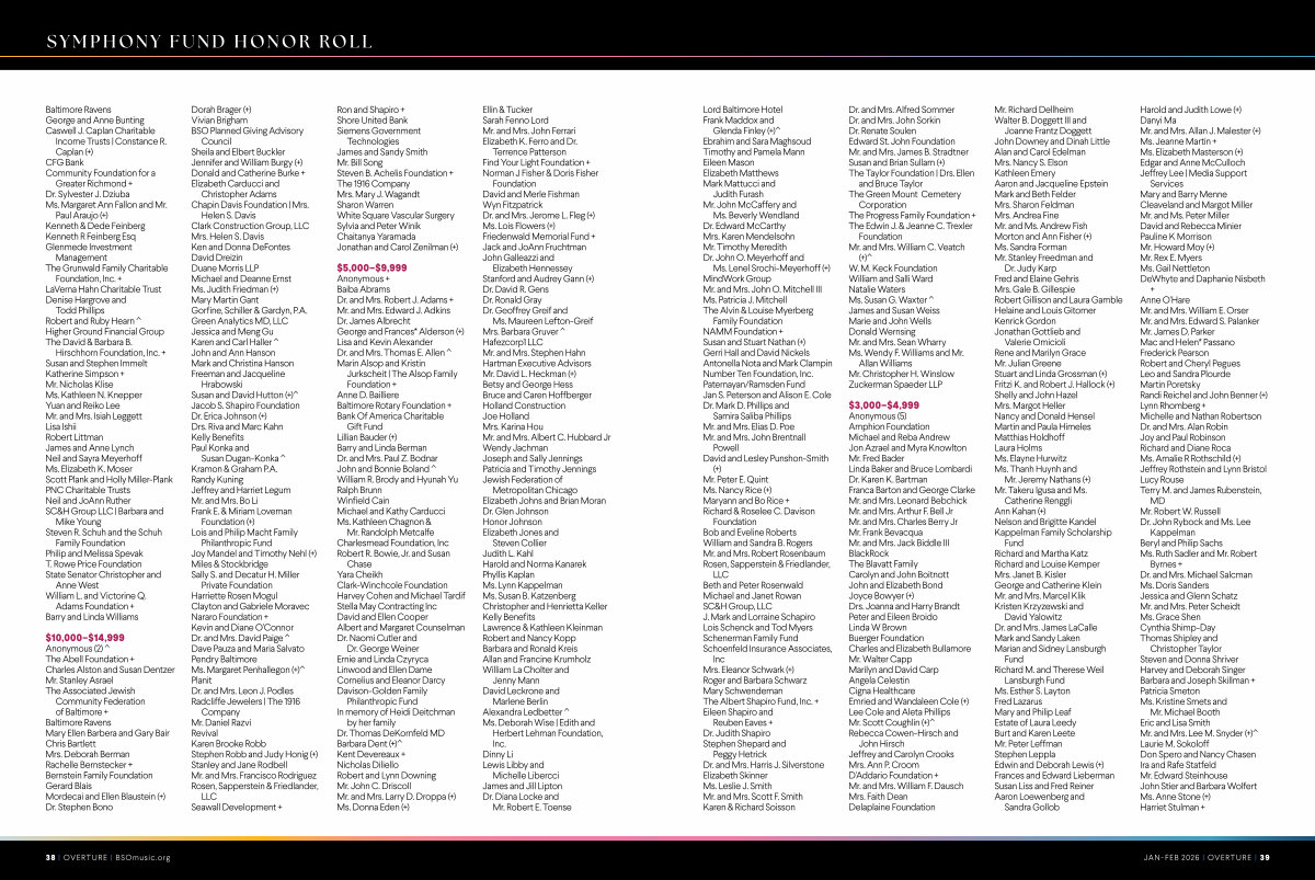 $ 3,000 –$ 4,999 Anonymous( 5) Amphion Foundation Michael and Reba Andrew Jon Azrael and Myra Knowlton Mr. Fred Bader Linda Baker and Bruce Lombardi Dr. Karen K. Bartman Franca Barton and George Clarke Mr. and Mrs. Leonard Bebchick Mr. and Mrs. Arthur F. Bell Jr Mr. and Mrs. Charles Berry Jr Mr. Frank Bevacqua Mr. and Mrs. Jack Biddle III BlackRock The Blavatt Family Carolyn and John Boitnott John and Elizabeth Bond Joyce Bowyer(+) Drs. Joanna and Harry Brandt Peter and Eileen Broido Linda W Brown Buerger Foundation Charles and Elizabeth Bullamore Mr. Walter Capp Marilyn and David Carp Angela Celestin Cigna Healthcare Emried and Wandaleen Cole(+) Lee Cole and Aleta Phillips Mr. Scott Coughlin(+) ^ Rebecca Cowen-Hirsch and