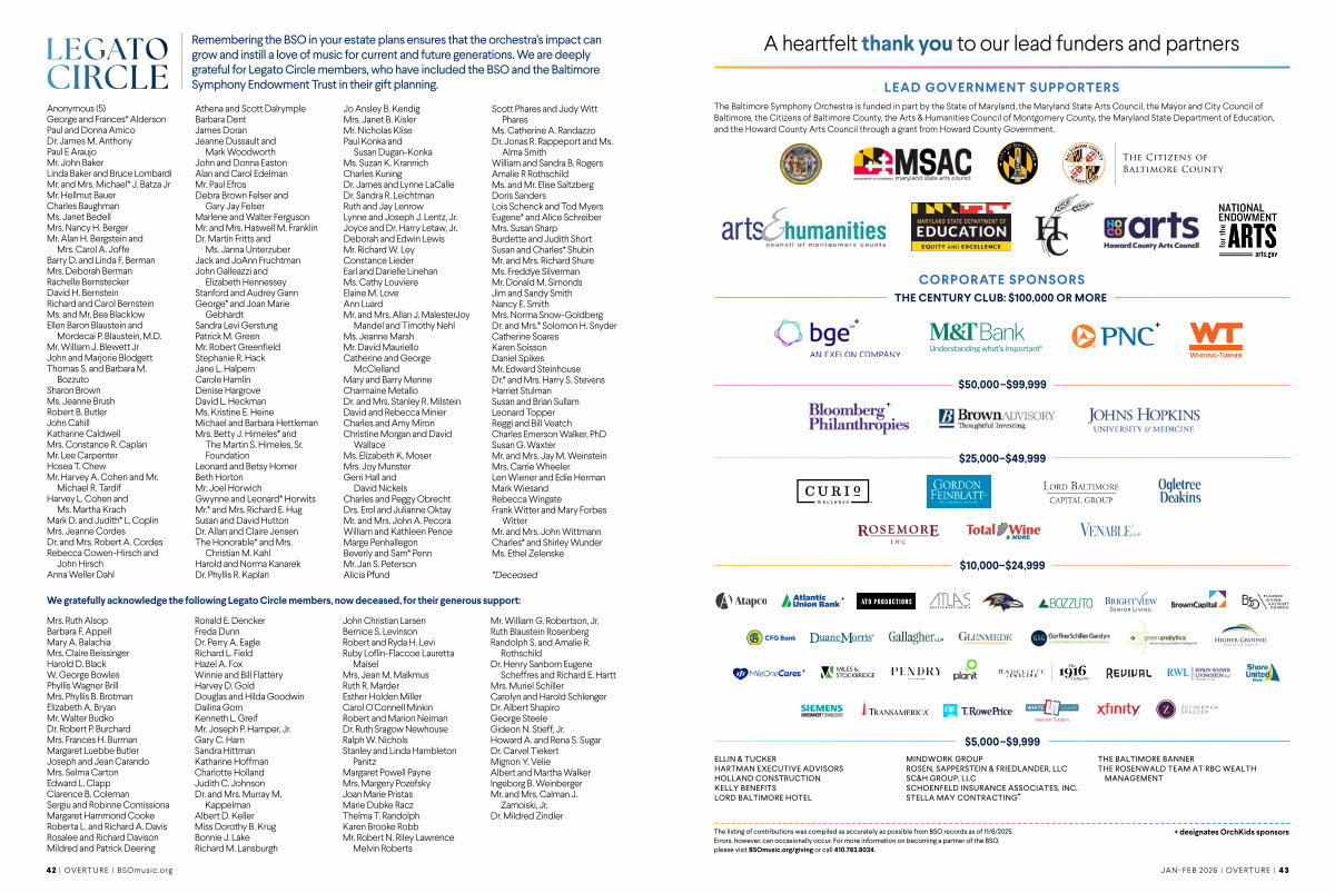 The listing of contributions was compiled as accurately as possible from BSO records as of 11 / 6 / 2025. Errors, however, can occasionally occur. For more information on becoming a partner of the BSO, please visit BSOmusic. org / giving or call 410.783.8034.
