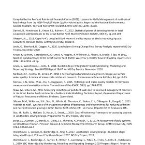 Compiled by the Reef and Rainforest Research Centre ( 2021 ). Lessons for Gully Management : A synthesis of key findings from the NESP Tropical Water Quality Hub research . Report to the National Environmental Science Program . Reef and Rainforest Research Centre Limited , Cairns ( 20pp ).