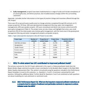 The primary outcome for the LDC Project addressed in this report is : Reduced pollutant loads from the Bowen Broken Bogie catchment provide a major contribution to the Burdekin Basin targets in the Reef 2050 Water Quality Improvement Plan . This section is structured using the questions included in the Performance Report template relevant to this outcome , i . e ., Question 1 , 2 and 3 . A summary is presented for each question , followed by additional detail . Further detail for Questions 2 and 3 are combined as both questions are about modelling at a sub catchment or catchment scale .