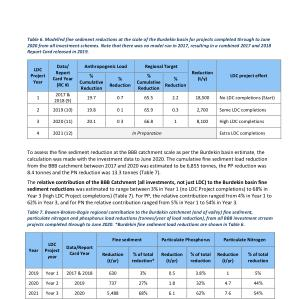Table 6 . Modelled fine sediment reductions at the scale of the Burdekin basin for projects completed through to June 2020 from all investment schemes . Note that there was no model run in 2017 , resulting in a combined 2017 and 2018 Report Card released in 2019 .