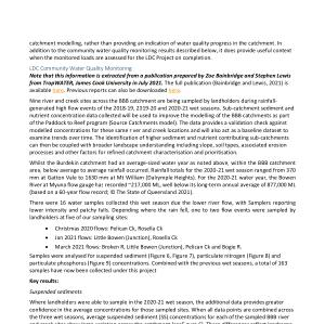 Nine river and creek sites across the BBB catchment are being sampled by landholders during rainfallgenerated high flow events of the 2018-19 , 2019-20 and 2020-21 wet seasons . Sub-catchment sediment and nutrient concentration data collected will be used to improve the modelling of the BBB catchments as part of the Paddock to Reef program ( Source Catchments model ). The data provides a validation check against modelled concentrations for these same river and creek locations and will also act as a baseline dataset to examine trends over time . The identification of higher sediment and nutrient contributing sub-catchments can then be coupled with broader landscape understanding including slope , soil types , associated erosion processes and other factors for refined catchment characterisation and prioritisation .