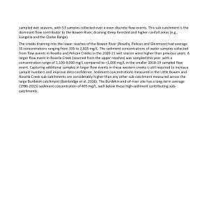 The creeks draining into the lower reaches of the Bowen River ( Rosella , Pelican and Glenmore ) had average SS concentrations ranging from 335 to 2,815 mg / L . The sediment concentrations of water samples collected from flow events in Rosella and Pelican Creeks in the 2020-21 wet season were higher than previous years . A larger flow event in Rosella Creek ( sourced from the upper reaches ) was sampled this year , with a concentration range of 3,100-9,000 mg / L compared to < 1,000 mg / L in the smaller 2018-19 sampled flow event . Capturing additional samples in larger flow events in these western creeks is still required to increase sample numbers and improve data confidence . Sediment concentrations measured in the Little Bowen and Rosella Creek sub-catchments are considerably higher than any other sub-catchment measured across the large Burdekin catchment ( Bainbridge et al . 2016 ). The Burdekin end-of-river site has a long-term average ( 1986-2015 ) sediment concentration of 405 mg / L , well below these high-sediment contributing subcatchments .