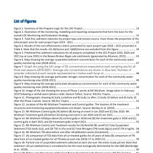 Figure 1 . Summary of the Program Logic for the LDC Project . .......................................................................... 14 Figure 2 . Illustration of the monitoring , modelling and reporting components that form the basis for the overall LDC Monitoring and Evaluation Strategy . ............................................................................................. 15 Figure 3 . Total fine sediment reduction by project type and erosion source . Inset shows the proportion of the total project area for each project type 2019 - 2021 . ....................................................................................... 22 Figure 4 . Results of the cost-effectiveness metric presented for each project type 2018 – 2021 presented in Table 4 . Note that the results <$ 1.00 / tonne and >$ 600 / tonne are excluded from this figure . ....................... 34 Figure 5 . Predicted fine sediment reductions for all projects completed in the LDC Project 2019 , 2020 and 2021 ( as at June 2021 ) in the Bowen Broken Bogie sub-catchments ( generated by Alluvium , 2021 ). ............ 43 Figure 6 . Map showing the average suspended sediment concentration for each of the community water quality monitoring sites ( 2018-2021 ). ............................................................................................................... 47 Figure 7 . Graph showing the full range of SS concentrations measured at each sampling site for all three wet seasons ( 2018-2021 ). Average site concentrations are shown in blue text . Number of samples collected at each sample represented as n below each boxplot . ............................................ 48 Figure 8 . Map showing the average particulate nitrogen concentration for each of the community water quality monitoring sites ( 2018-2021 ). ............................................................................................................... 49 Figure 9 . Map showing the average particulate phosphorus concentration for each of the community water quality monitoring sites ( 2018-2021 ). ............................................................................................................... 50 Figure 10 . Image of the site showing the areas of Phase 1 works at Mt Wickham . Image taken in February 2019 following a rainfall event ( photo credit : Damon Telfer ). Source : NQ Dry Tropics . .................................. 51 Figure 11 . Photographs showing A ) Gully 1a before and B ) Gully 1a after , C ) Gully 10 before and D ) Gully 10 after the Phase 1 works . Source : NQ Dry Tropics . ............................................................................................ 52 Figure 12 . Location of the Mt Wickham Treatment and Control gullies . The location of the treatment structures and monitoring equipment / locations are shown . Source : Bartley et al . ( 2020 ). ............................ 53 Figure 13 . Mt Wickham Control gully ( A ) before ( B ) during an event in Jan 2020 and ( C ) Dec 2020 . Mt Wickham Treatment gully ( D ) before ( E ) during and event in Jan 2020 and ( F ) Jan 2021 . ............................... 54 Figure 14 . Mt Wickham hillslope above ( A ) control gully in 2018 and ( B ) the treatment gully in 2018 and ( C ) control gully in April 2021 and ( D ) treatment gully in April 2021 . .................................................................... 55 Figure 15 . Mt Wickham Control and Treatment results for ( A ) Rainfall ( B ) runoff ( C ) Total Suspended Sediment ( TSS ) loads ( t / y ), and ( D ) TSS in t / ha and ( E ) Total Nitrogen ( TN ) loads ( kg / y ) and ( F ) TN in kg / ha . 58 Figure 16 . Mt Wickham TSS data before and after rehabilitation works ( treatment ).. .................................... 59 Figure 17 . ( A ) comparison of TSS data from all un-treated gullies for all years of data ( B ) comparison of TN data from all un-treated gullies for all TN data at each site ( 2016-17 to 2020-21 ). ......................................... 59 Figure 18 . Particle size of suspended sediment collected at each site over the entire study period . Note that sediment < 20 µ m ( dotted line ) is considered to be the most ecologically detrimental for the GBR ( Bainbridge et al ., 2018 ). ....................................................................................................................................................... 60 Figure 19 : Before and after images of the Glen Bowen Treatment gully ( Image source : NQ Dry Tropics ). ..... 61 Figure 20 . Location of the Glen Bowen Treatment and Control gullies . The location of the treatment structures and monitoring equipment / locations are shown . Source : Bartley et al . ( 2021 ). ............................ 63 Figure 21 : Glen Bowen hillslope above ( A ) control gully and ( B ) the treatment gully at the end of the 2020-21 wet season . ........................................................................................................................................................ 63 Figure 22 : Glen Bowen water quality monitoring station set up ( A , D ). The instrumentation setup is the same at both treatment and control sites ( B ) the control site sensor cluster on the bed of the gully and ( C ) the control site sensors during an event that was just above the event threshold for sample collection . ( E ) The treatment gully sensor during an event on 7 January 2021 and ( F ) an event at the control site on the same date in Jan 2021 . ................................................................................................................................................ 64 Figure 23 . ( A ) TSS concentration and ( B ) TN concentrations at Glen Bowen for the 2019 / 20 wet season . No samples were collected the treatment site in 2019-20 or 2020-21 . ................................................................. 65