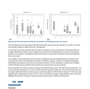 As the treatment site had no runoff or samples in the 2019 / 20 wet season , the effectiveness value was ~ 1.0 , as the treatment appeared to ‘ cut off ’ all runoff and water quality for that year . This year the treatment was no longer significant relative to previous years , and we assigned an effectiveness rating of 0 . These two years together give an effectiveness value of ~ 0.5 or 50 %. The dramatic changes in data between years at this site highlight the benefits of long-term temporal monitoring to assess treatment effectiveness .
