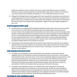 ● The Mt Pleasant site implemented a landscape rehydration project with a concurrent aim to reduce the erosive force of runoff within the treatment gully . This project appears to have had some success ; however , the changes between the treatment and control site are small as the property was already in relatively good condition compared to other sites . When properties have good vegetation metrics and relatively mature and inactive gully / channel systems , rehabilitation is not worth doing for water quality benefits alone . There is negligible improvement in water quality and sediment savings relative to other more active gully sites , however , there may be other benefits including increased ecological habitat and increased soil moisture .