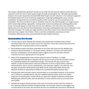 3 . Many of the mapped gullies have not been ground-truthed . Therefore , it is highly recommended that field data is fed back into the analysis as part of the site evaluation process for developing detailed site rehabilitation designs . This process will rigorously evaluate whether on-ground observations match the predictions ( in terms of gully activity , sediment yield predictions , the priority for rehabilitation , costs estimates , logistics , soil materials , etc .). The gully classification developed through NESP and the Queensland Water Monitoring Network would be an appropriate framework for systematically gathering these data .