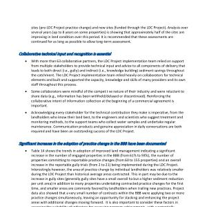 • Table 14 shows the trends in adoption of improved land management indicating a significant increase in the number of engaged properties in the BBB ( from 61 % to 93 %), the number of properties committing to reportable practice changes ( from 60 to 155 properties ) and an overall increase in the reportable gully trials ( from 2 to 21 ) being implemented during the LDC Project . Interestingly however , the area of practice change by individual landholders was relatively smaller during the LDC Project than historical average areas contracted . This in part may be due to the increase in gully sites ( generally gully sites have a small overall ha but a higher sediment reduction per unit area ) in addition to many properties undertaking contracted practice changes for the first time , and smaller areas are commonly favored by landholders when trailing new practices . Project data also showed that a very small number of contracts within the BBB were applying two or more practice changes simultaneously , leaving an opportunity for stacking and enhancing the project areas with additional changes moving forward . It is also important to consider these factors in assessing the suitability of indicators for assessing program achievements , with a potentially increasing shift to smaller scale more intensive remediation activities that deliver large pollutant benefits and therefore project area is not necessarily a good indication of the potential water quality outcomes .