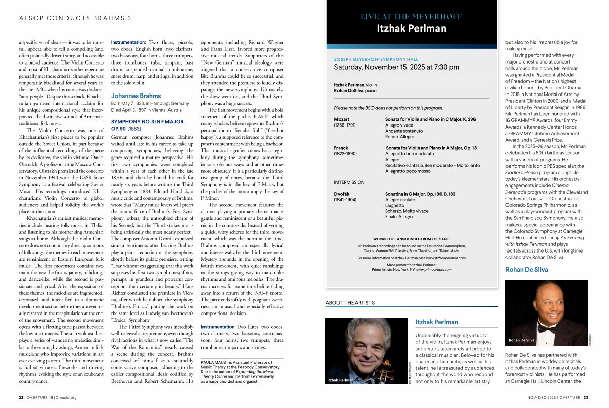 Khachaturian’ s earliest musical memories include hearing folk music in Tbilisi and listening to his mother sing Armenian songs at home. Although the Violin Concerto does not contain any direct quotations of folk songs, the themes in each movement are reminiscent of Eastern European folk music. The first movement contains two main themes: the first is jaunty, rollicking, and dance-like, while the second is passionate and lyrical. After the exposition of these themes, the melodies are fragmented, decorated, and intensified in a dramatic development section before they are eventually restated in the recapitulation at the end of the movement. The second movement opens with a fleeting tune passed between the low instruments. The solo violinist then plays a series of wandering melodies similar to those sung by ashugs, Armenian folk musicians who improvise variations in an ever-evolving pattern. The third movement is full of virtuosic fireworks and driving rhythms, evoking the style of an exuberant country dance.