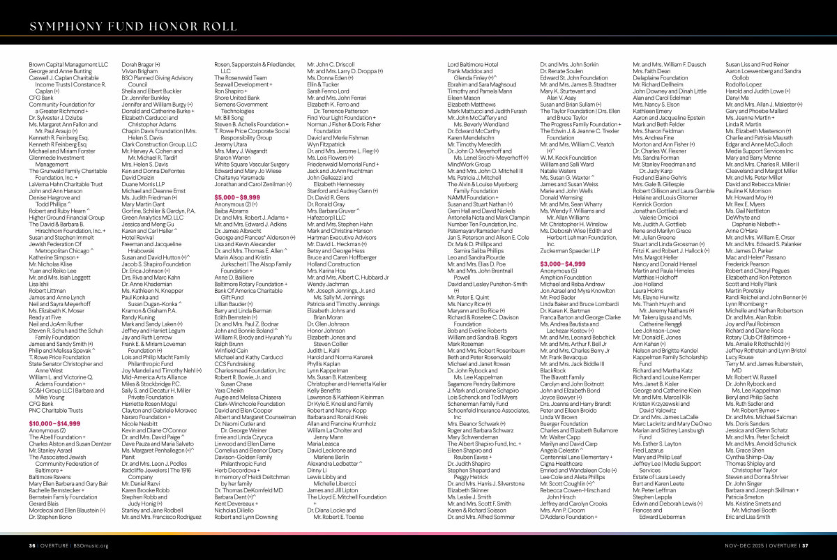Daphanie Nisbeth + Anne Oā Hare Mr. and Mrs. William E. Orser Mr. and Mrs. Edward S. Palanker Mr. James D. Parker Mac and Helen * Passano Frederick Pearson Robert and Cheryl Pegues Elizabeth and Ron Peterson Scott and Holly Plank Martin Poretsky Randi Reichel and John Benner(+) Lynn Rhomberg + Michelle and Nathan Robertson Dr. and Mrs. Alan Robin Joy and Paul Robinson Richard and Diane Roca Rotary Club Of Baltimore + Ms. Amalie R Rothschild(+) Jeffrey Rothstein and Lynn Bristol Lucy Rouse Terry M. and James Rubenstein,