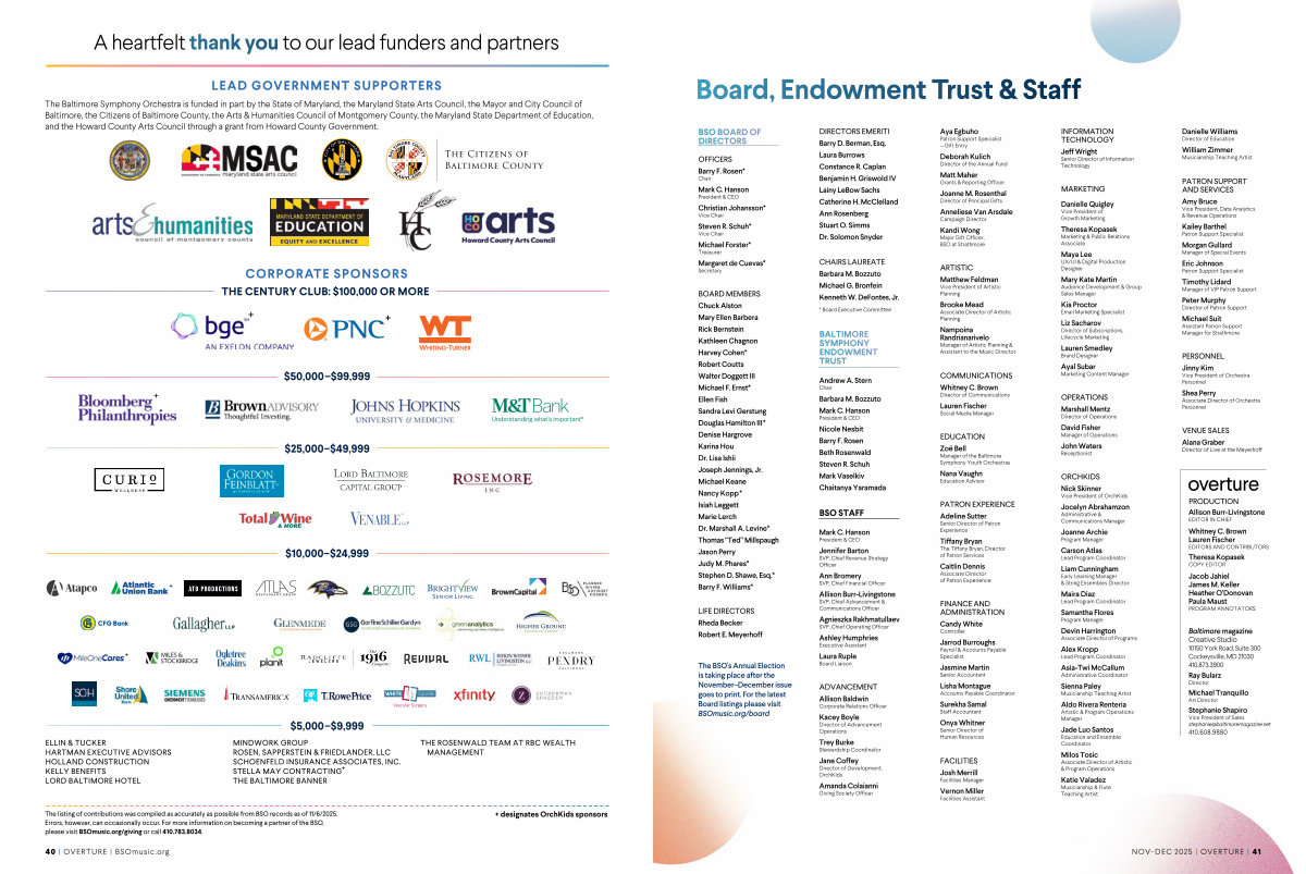 The listing of contributions was compiled as accurately as possible from BSO records as of 11 / 6 / 2025. Errors, however, can occasionally occur. For more information on becoming a partner of the BSO, please visit BSOmusic. org / giving or call 410.783.8034.