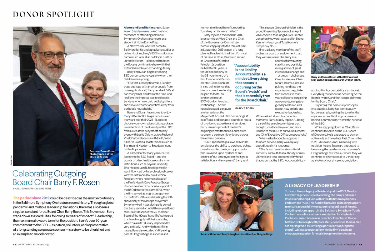 The period since 2019 could be described as the most evolutionary in the Baltimore Symphony Orchestra’ s recent history. Through a global pandemic and multiple leadership transitions, there has also been a singular, constant force: Board Chair Barry Rosen. This November, Barry steps down as Board Chair following six years of impactful leadership, the maximum allowable term for the position. Barry ' s over 50-year commitment to the BSO— as patron, volunteer, and representative of a longstanding corporate sponsor— is a story to be cherished and an example to be celebrated.