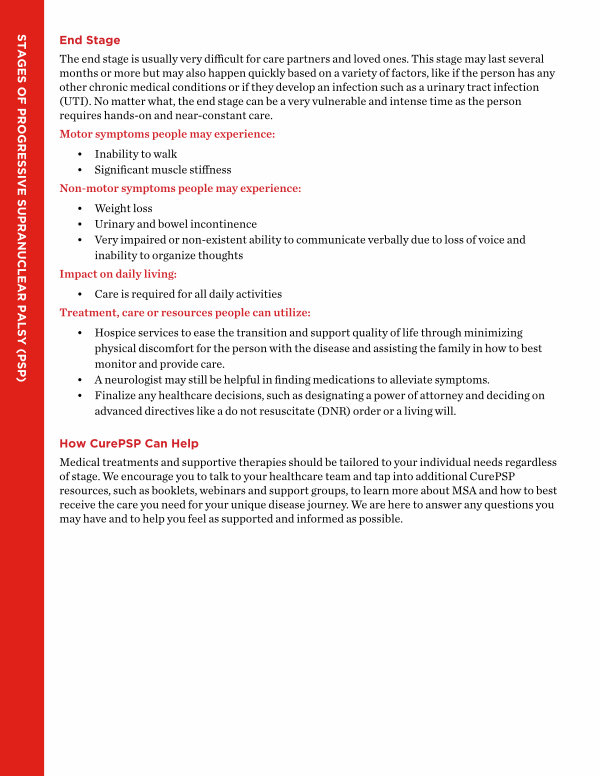 Medical treatments and supportive therapies should be tailored to your individual needs regardless of stage. We encourage you to talk to your healthcare team and tap into additional CurePSP resources, such as booklets, webinars and support groups, to learn more about MSA and how to best receive the care you need for your unique disease journey. We are here to answer any questions you may have and to help you feel as supported and informed as possible.