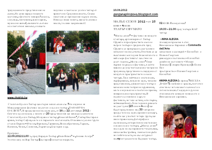 22.09.201211.00 ч., пред Народен Театър „Иван Вазов“ – „Анима Алегра“ Улично шоу на Жар Театър (България) за всички възрасти.