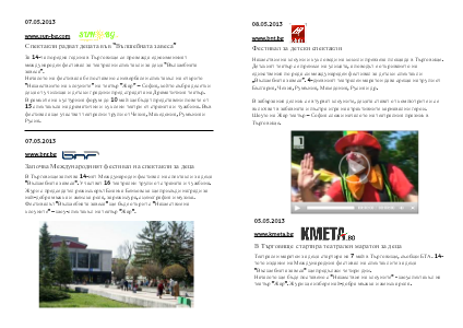 В Търговище започва 14-ият Международен фестивал на спектакли за деца "Вълшебната завеса". Участват 16 театрални трупи от страната и чужбина. Жури с председател режисьорът Бианка Бенковска ще присъди награди за най-добра мъжка и женска роля, за режисура, сценография и музика.