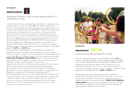 Хепънинг в Деня извън времето е организиран в София. 25 юли е обявен за Ден извън времето, в който се правят фестивали за “Мир чрез култура”. Фондация “ЖАР ТЕАТЪР-ИЗКУСТВО-КУЛТУРА” ще разкрие някои тайни на карнавалното и огненото изкуство. Желаещите ще пробват танц с огън и огнени реквизити заедно с екипа на организацията. Хепънингът ще се проведе в градинката пред Народния театър “Иван Вазов” от 18.30 до 21.30 часа.
