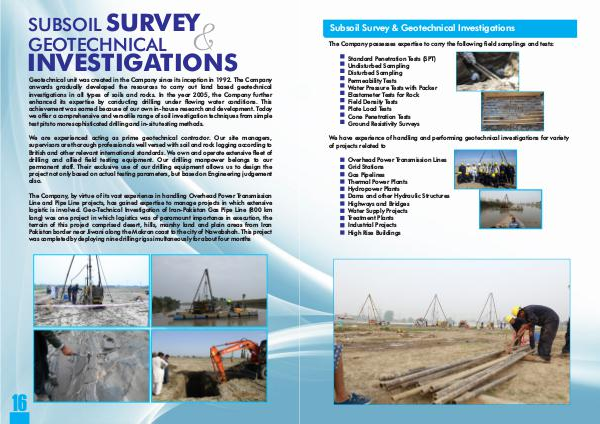 Geotechnical unit was created in the Company since its inception in 1992. The Company onwards gradually developed the resources to carry out land based geotechnical investigations in all types of soils and rocks. In the year 2005, the Company further enhanced its expertise by conducting drilling under �owing water conditions. This achievement was earned because of our own in-house research and development. Today we offer a comprehensive and versatile range of soil investigation techniques from simple test pits to more sophisticated drilling and in-situ testing methods.