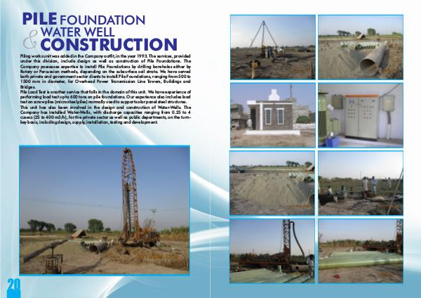 Piling works unit was added in the Company out�t, in the year 1993. The services, provided under this division, include design as well as construction of Pile Foundations. The Company possesses expertise to install Pile Foundations by drilling boreholes either by Rotary or Percussion methods, depending on the subsurface soil strata. We have served both private and government sector clients to install Pile Foundations, ranging from 500 to 1500 mm in diameter, for Overhead Power Transmission Line Towers, Buildings and Bridges. Pile Load Test is another service that falls in the domain of this unit. We have experience of performing load test up to 600 tons on pile foundations. Our experience also includes load test on screw piles( micro steel piles) normally used to support solar panel steel structures. This unit has also been involved in the design and construction of Water-Wells. The Company has installed Water-Wells, with discharge capacities ranging from 0.25 to 4 cusecs( 25 to 400 m3 / h), for the private sector as well as public departments, on the turnkey basis, including design, supply, installation, testing and development.