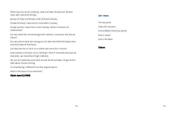 LAZY - Chisom This lazy poet Takes this lazy pen And scribbles these lazy words; God is a poet God is the Base Chisom 305