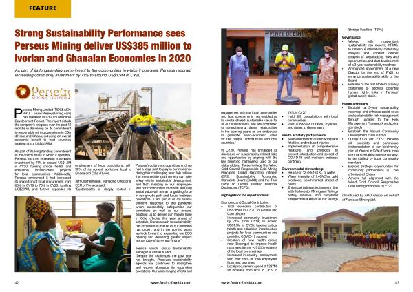 Perseus Mining Limited ( TSX & ASX : PRU ) ( www . PerseusMining . com ) has released its CY20 Sustainable Development Report . The report details the company ’ s progress over the past 12 months in delivering on its commitment to responsible mining operations in Côte d ’ Ivoire and Ghana , including an overall economic benefit to host countries totalling about USD $ 385M .