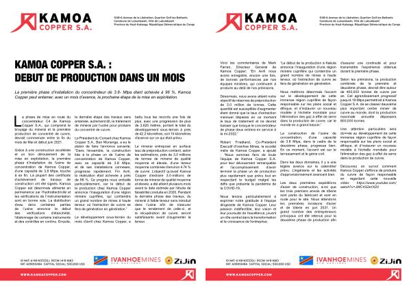 et un bon mise déroulement en œuvre réussie de et la continue liée à du la site phase minier un de Kamoa l ’ usine , Ivanhoe de les Mines estimations Energy , près DRC , de une 3,0 société-sœur millions | |||||||||