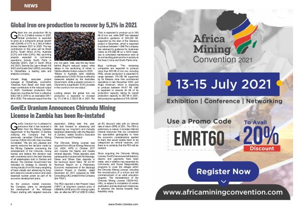 Global iron ore production to recover by 5,1 % in 2021