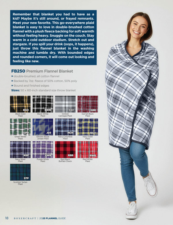 » double-brushed, all cotton flannel » Backed by 7oz. fleece of 50 % cotton, 50 % poly » Bound and finished edges Sizes: 50 x 60-inch standard size throw blanket