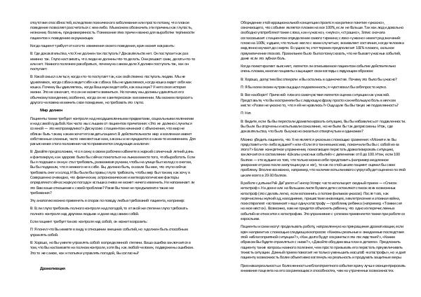 Пациенты также требуют контроля над неодушевленными предметами, социальными явлениями и над самой судьбой. Как часто мы слышим от пациентов причитания: « Это не должно случиться со мной— это несправедливо!» Дискуссию с пациентом начинают с объяснения, что мир не обязан быть таким, каким хочет его видеть пациент. В действительности мир и вселенная имеют собственные сложные, часто неизвестные нам, законы и не нуждаются в каких-то изменениях. Для разъяснения этого положения часто применяется следующая аналогия: