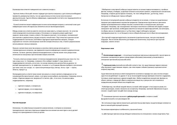 Между вопросом и ответом имеется логическая зависимость, которая означает, что качество ответа определяется качеством вопроса. В полемике и в процессе допроса действует правило: каков вопрос, таков и ответ. Это правило означает, что на вопрос, поставленный расплывчато и двусмысленно, трудно получить точный ответ. Под точностью в данном случае подразумевается логическая, понятийно-структурная характеристика вопроса, которая выражается в точности используемых понятий и вопросительных слов, а также в рациональном использовании сложных вопросов.