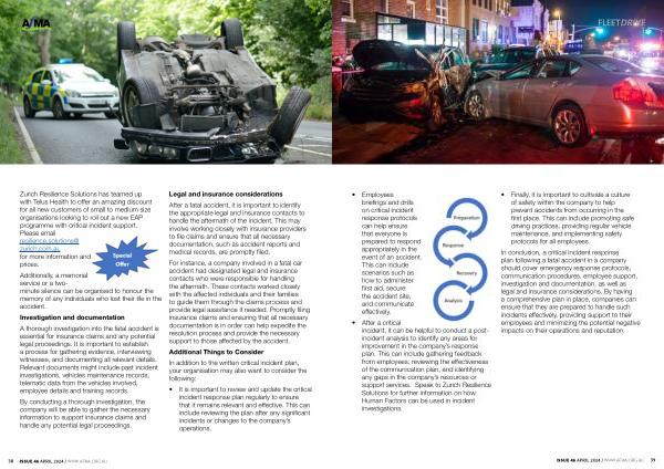• Finally , it is important to cultivate a culture of safety within the company to help prevent accidents from occurring in the first place . This can include promoting safe driving practices , providing regular vehicle maintenance , and implementing safety protocols for all employees .