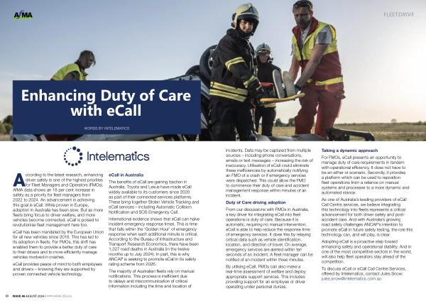 According to the latest research , enhancing driver safety is one of the highest priorities for Fleet Managers and Operators ( FMOs ). AfMA data shows an 18 per cent increase in safety as a priority for fleet managers from 2022 to 2024 . An advancement in achieving this goal is eCall . While proven in Europe , adoption in Australia has been slow . But as more fleets bring focus to driver welfare , and more vehicles become connected , eCall is poised to revolutionise fleet management here too .