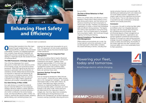 In conclusion , the path to enhancing fleet safety and efficiency lies in an integrated approach that aligns with the broader ESG framework . By considering the environmental , social , and financial aspects of fleet management as interconnected elements , organisations can achieve significant operational improvements . Whether it ’ s through eco-safe driving practices , strategic insurance management , or fostering a culture of safety and well-being , the benefits of this holistic approach are clear : reduced costs , improved safety , and a more sustainable future for fleet operations .