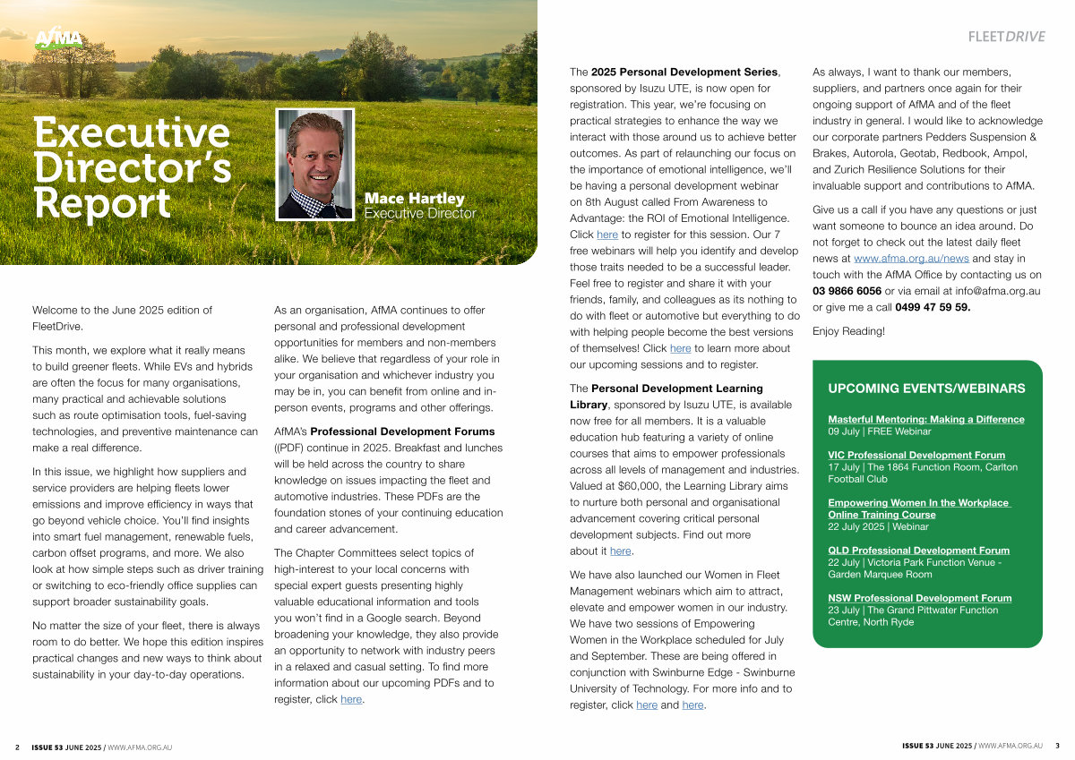 AfMA’ s Professional Development Forums(( PDF) continue in 2025. Breakfast and lunches will be held across the country to share knowledge on issues impacting the fleet and automotive industries. These PDFs are the foundation stones of your continuing education and career advancement.