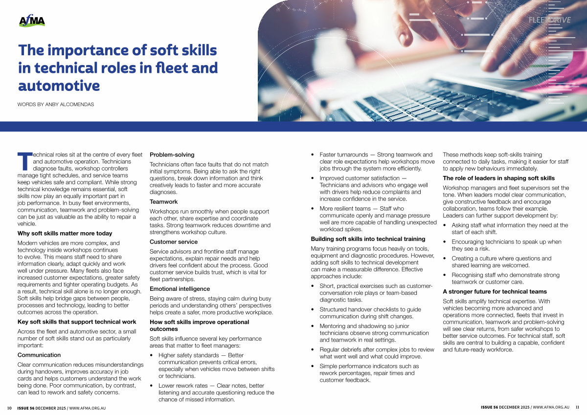 Soft skills amplify technical expertise. With vehicles becoming more advanced and operations more connected, fleets that invest in communication, teamwork and problem-solving will see clear returns, from safer workshops to better service outcomes. For technical staff, soft skills are central to building a capable, confident and future-ready workforce.