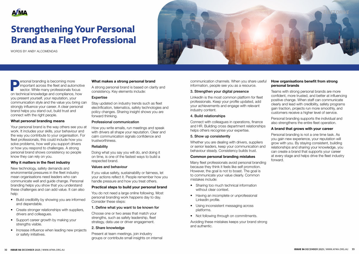Personal branding is not a one time task. As you gain new experience, your reputation will grow with you. By staying consistent, building relationships and sharing your knowledge, you can create a brand that supports your career at every stage and helps drive the fleet industry forward.
